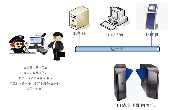 本方案特點是主要使用二代身份證進(jìn)行登記,結(jié)合身份證驗證儀器進(jìn)行合法性驗證和身份證信息的自動提取,使用出入驗證系統(tǒng)進(jìn)行出入授權(quán),結(jié)合閘機(jī)進(jìn)行嚴(yán)格的出入控制。可以根據(jù)需要組合出靈活多變的控制方式。