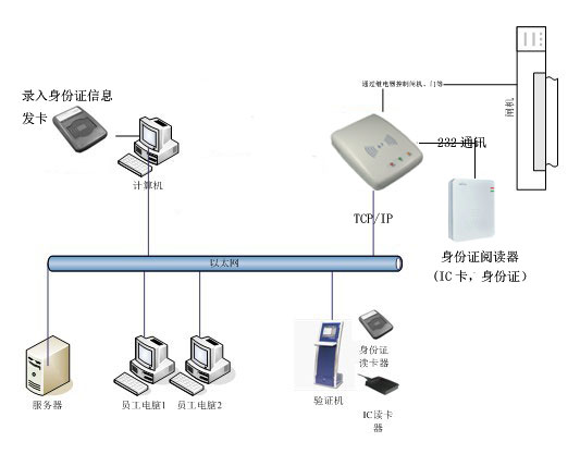 f) 身份證門禁控制器上的身份證閱讀器:讀取身份證信息,并實時上傳,同時鑒別身份證真假,以232串口信號發(fā)送給門禁控制盒,門禁控制盒有兩種工作方式,1、將刷卡信息上報到驗證機(jī),驗證機(jī)驗證通過后,發(fā)送開門指令開門。