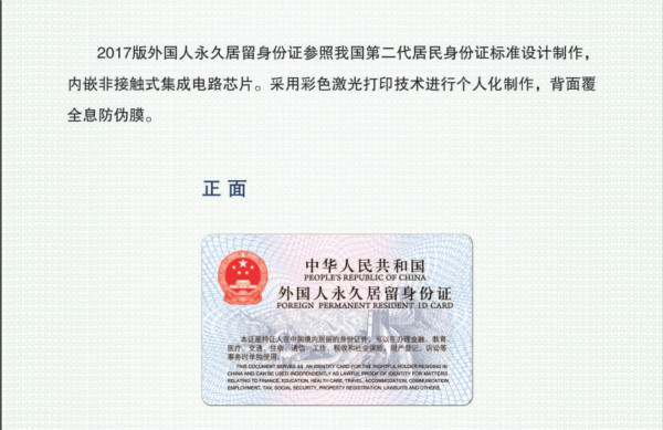 5月27日,公安部公告將于2017年6月16日起簽發2017版外國人永久居留身份證。同時停止簽發現行外國人永久居留證。永久居留身份證是外國人在我國境內證明自己身份的合法證件,是永久居留外國人享受在華資格待遇的有效憑證,可以使用第二代居民身份證閱讀機具讀取。屆時,永久居留身份證的實用效能將大幅提升,新增的機讀核驗功能也將進一步便利持證人在華工作和生活,為永久居留外國人提供良好的社會服務,切實增強永久居留外國人的獲得感。